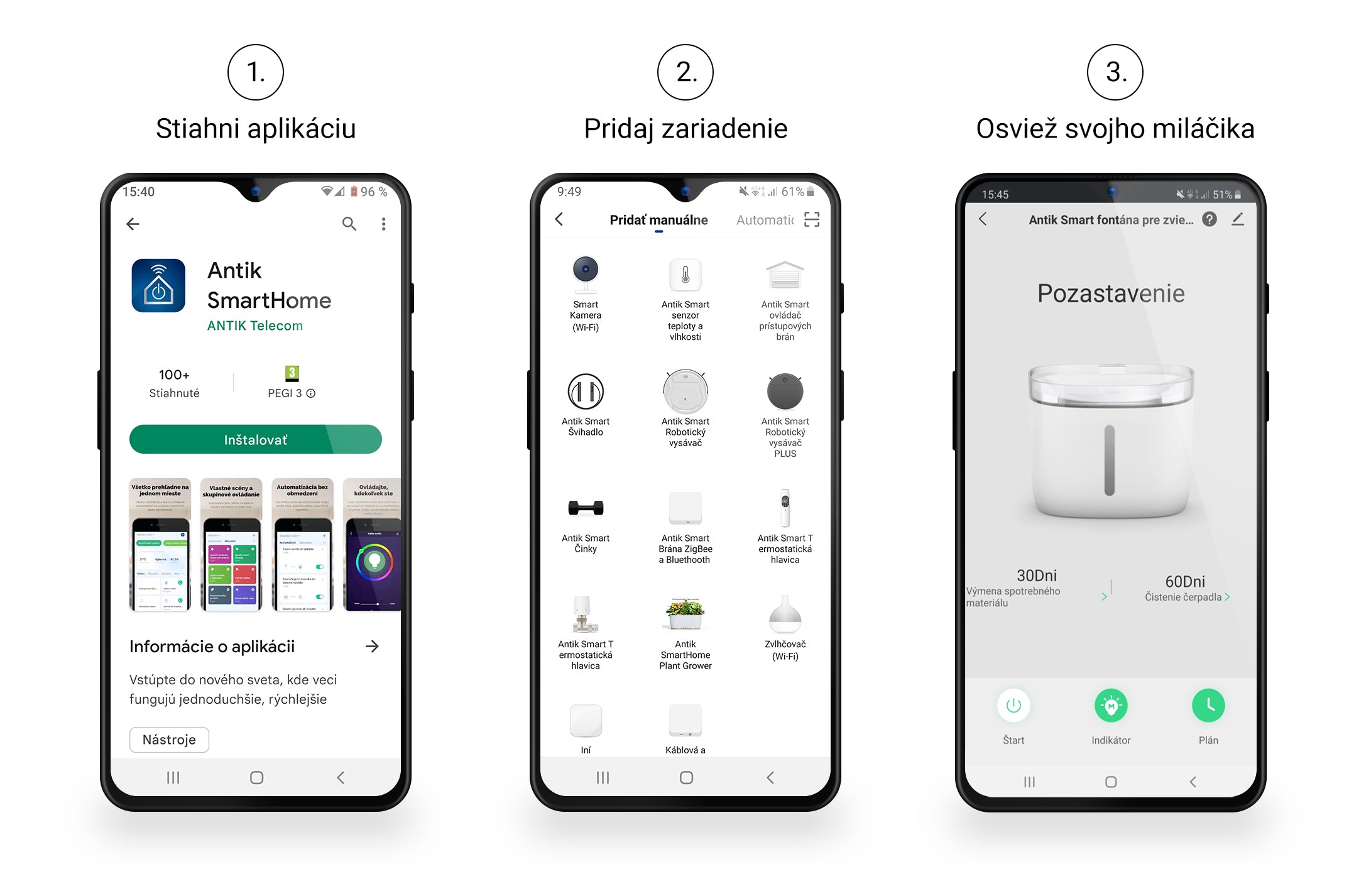 ANTIK smart fontána pre zvieratá sa dá ovládať prostredníctvom aplikácie ANTIK SmartHome aj manuálne. V Antik SmartHome aplikácií máte možnosť nastaviť plán zapnutia a vypnutia fontány vo vopred stanovených časoch. Požadované funkcie máte možnosť nastaviť aj manuálne, pomocou tlačidiel na zariadení. Špeciálne LED diódy umiestnené v nádobe fontány poskytujú informáciu o stave hladiny vody. Súčasťou je aj funkcia pripomenutia výmeny filtra.