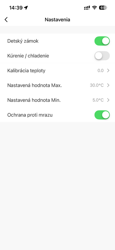 | Detský zámok | Zapnuté, Vypnuté | Zamyká manuálne ovládanie termostatu. | Zapnem Detský zámok pred odchodom z domu. |