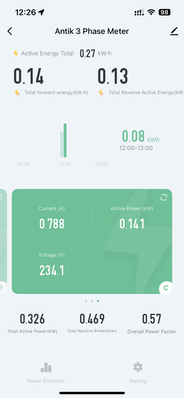 Podobne ako predchádzajúce snímky, táto obrazovka zobrazuje hlavné merania pre fázu C, vrátane prúdu, aktívneho výkonu a napätia. Umožňuje tak sledovať spotrebu na každej fáze samostatne.