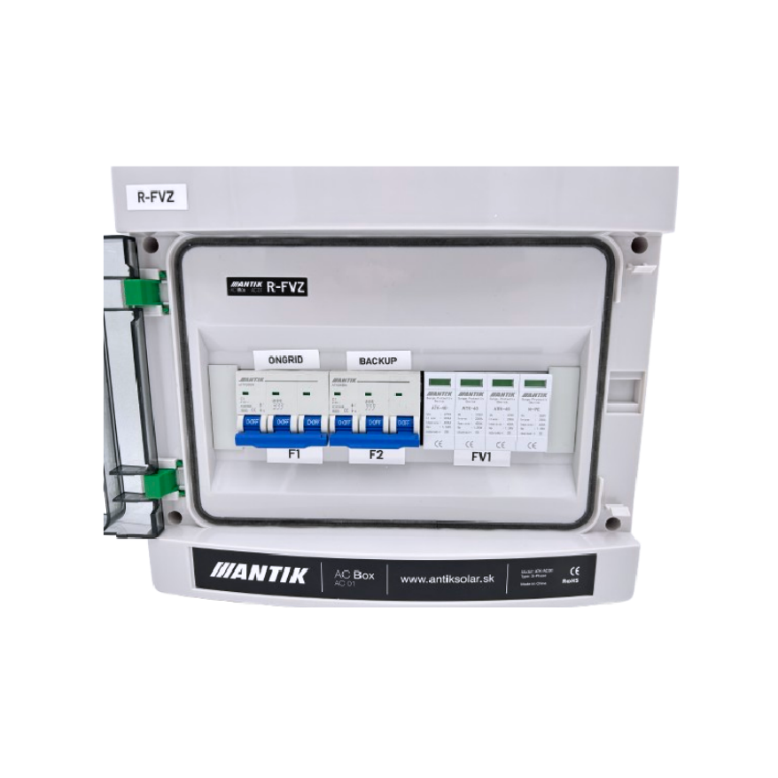 ANTIK AC Box AC01 3-fázový je 3-fázový AC rozvádzač určený pre on-grid aj off-grid fotovoltické systémy. Prepája menič so sieťou a záložným okruhom a vďaka integrovaným prvkom zaisťuje stabilnú a bezpečnú prevádzku celej inštalácie.