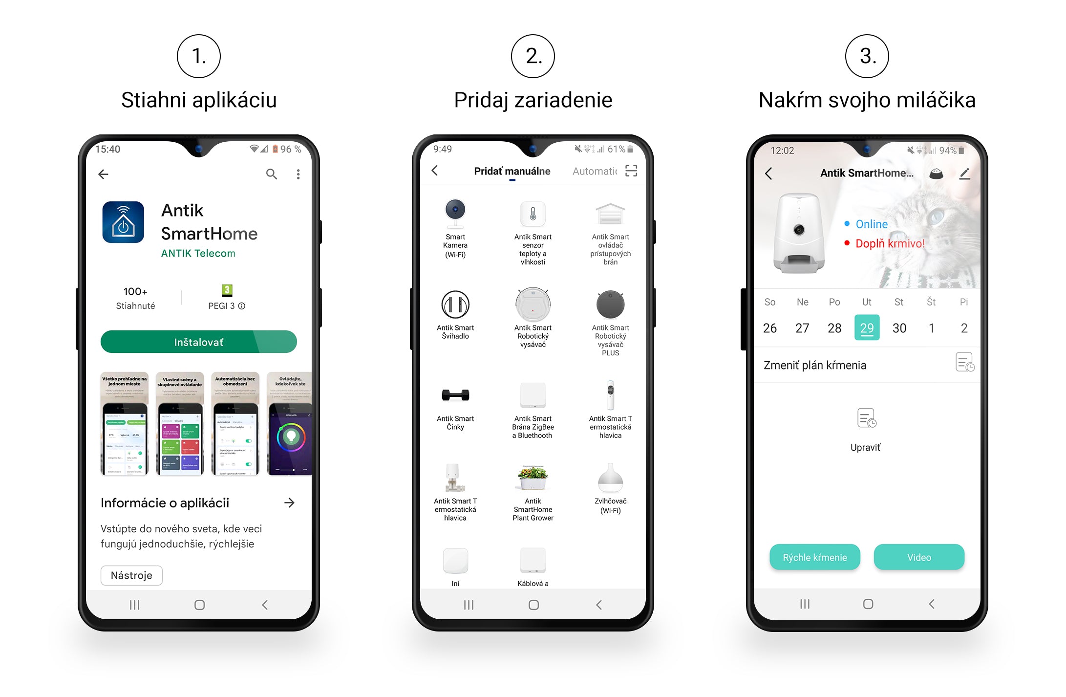 ANTIK SmartHome dávkovač potravy PLUS umožňuje naprogramovať plán kŕmenia vášho domáceho maznáčika prostredníctvom mobilnej aplikácie Antik SmartHome®. Môžete nastaviť čas, počet porcií a veľkosť porcie, čím zabezpečíte, že váš domáci miláčik dostane jedlo vždy načas, aj keď nie ste doma.