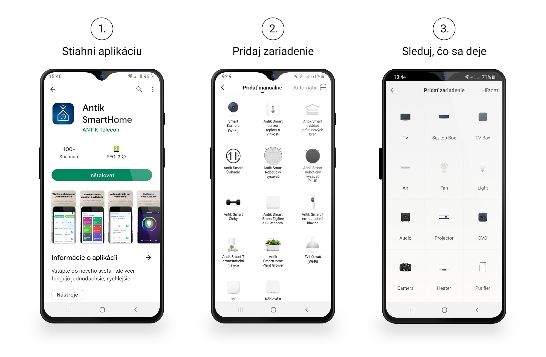 Antik Smart diaľkový ovládač vám umožní ovládať úplne všetko, čo doma máte. Je možné ovládať všetky zariadenia, pomocou infračerveného signálu (napr.: televízory, set-top-boxy, DVD prehrávače, HiFi zostavy, klimatizácie, ventilátory a iné). Pomocou mobilnej aplikácie Antik SmartHome® dokážete nastaviť, aby sa každé ráno pustilo rádio alebo cez víkend rozprávky pre deti. Pri odchode do práce jedným tlačidlom vypnete okrem svetiel aj televízor, rádio a utlmíte klimatizáciu. Počas vašej dovolenky môžete nastaviť zapínanie a prepínanie televízie a tak simulovať vašu prítomnosť v domácnosti. Zariadenie môže jednoducho prijímať signály infračerveného diaľkového ovládania v okolí a ukladať tieto signály pomocou funkcie učenia. Pri používaní zariadenia stačí na ovládanie domácich spotrebičov použiť iba váš telefón.