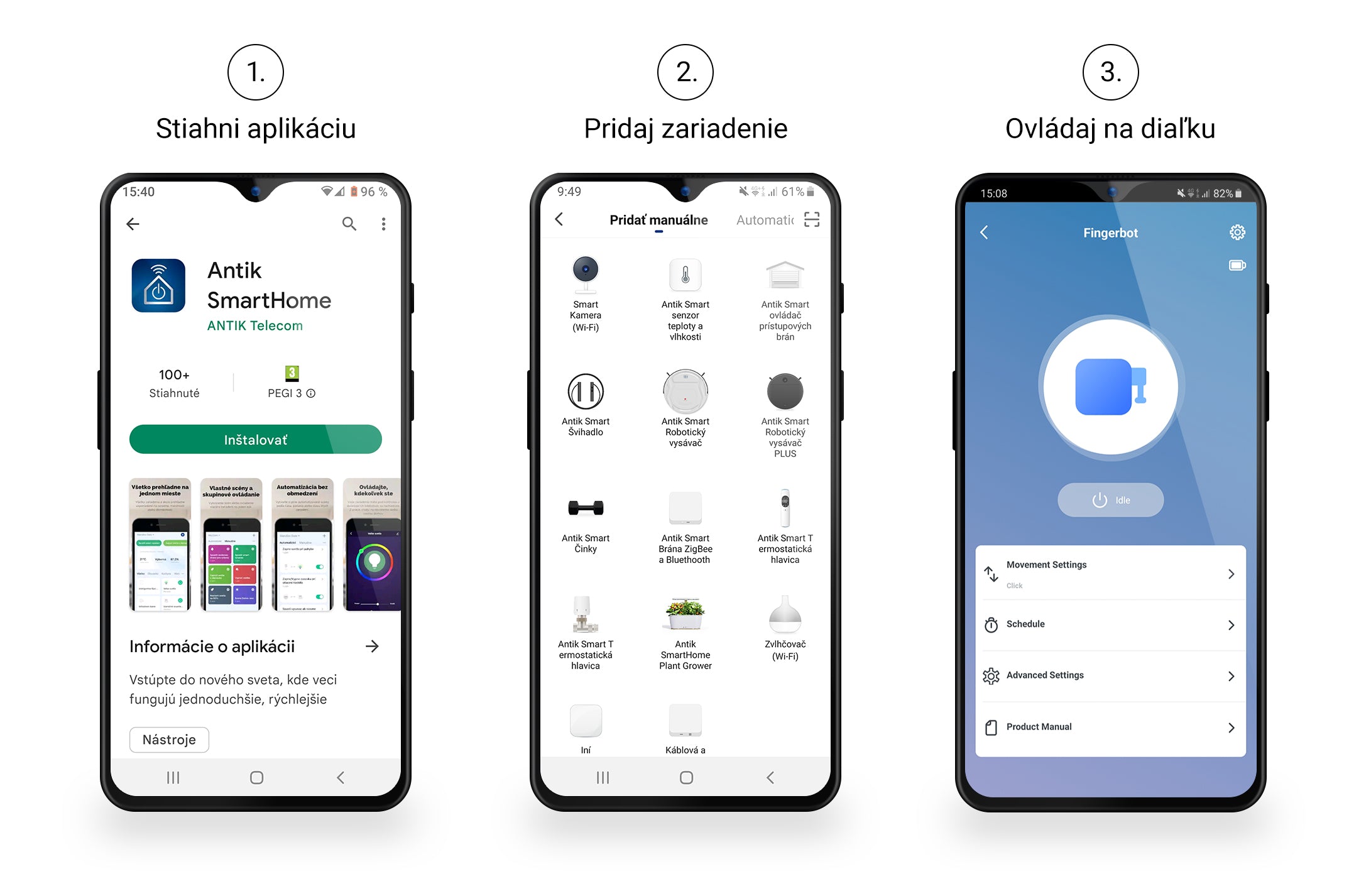 Vyberte režim v aplikácii ANTIK SmartHome a automaticky spustite tlačidlo kedykoľvek budete chcieť. Je kompatibilný s rôznymi tlačidlami a prepínačmi, jednoduchú inštaláciu a vďaka 3M páske sa môže prilepiť na akýkoľvek povrch.