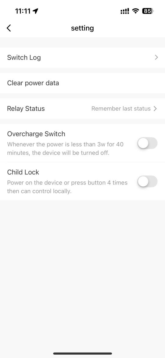 | Overcharge Switch | Zapnuté, Vypnuté | Vypne zásuvku, ak spotreba klesne pod 3 W po dobu 40 minút. | Ak spotreba dlhodobo klesne pod 3 W, zásuvka sa vypne, aby šetrila energiu. |