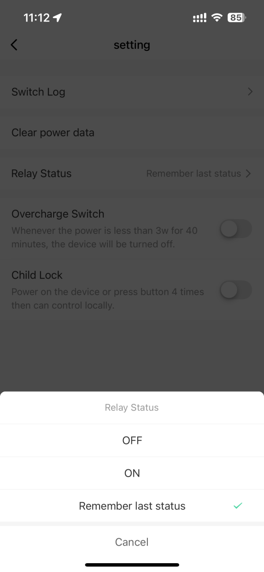 - Relay status: On / Off / Remember