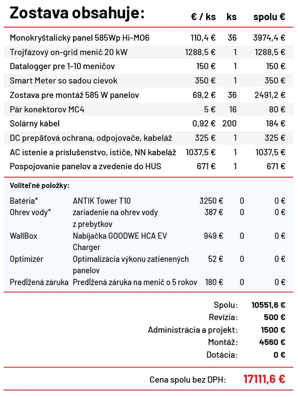 Vďaka transparentnej cene 17 111,60 € bez DPH presne viete, za čo platíte – bez skrytých poplatkov. Tento systém je ideálny pre firmy, ktoré hľadajú energetickú nezávislosť, úsporu nákladov a ekologické riešenie s dlhodobou návratnosťou a profesionálnou podporou od ANTIKu.