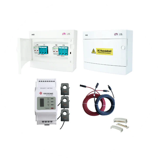 Elektroinštalačná sada obsahuje DC a AC rozvádzače, 25m kabeláže pre každý DC string, zemniacu svorkovnicu, smart meter a vývodový istič.
