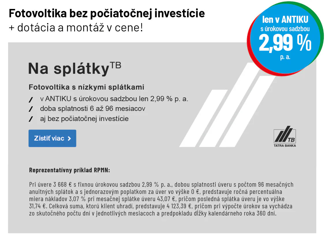 Prechod na solárnu energiu už nemusí predstavovať veľký jednorazový výdavok. Vďaka riešeniu Na splátky od Tatra banky si môžete zaobstarať vlastný fotovoltický systém ANTIK Domácnosť STRED – 7,07 kWp už dnes a splácať ho pohodlne v mesačných splátkach s úrokovou sadzbou len 2,99 % p. a.