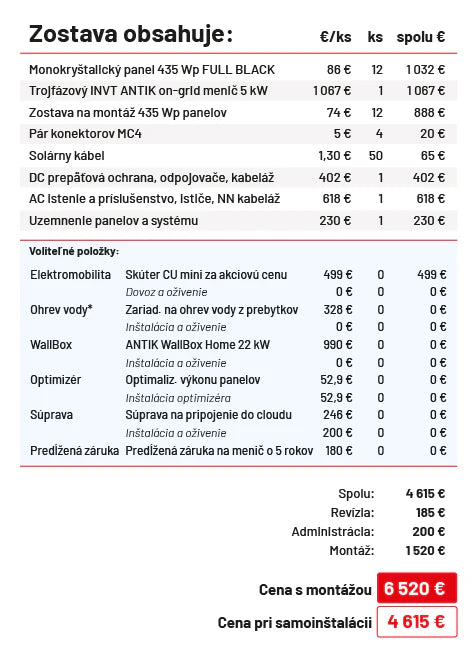 Zostava ANTIK Domácnosť E-MOTO – 5,22 kWp on-grid systém predstavuje inovatívne riešenie pre domácnosti, ktoré chcú nielen vyrábať vlastnú elektrinu, ale aj ju efektívne využívať na elektromobilitu. Cena už zahŕňa všetky hlavné komponenty vrátane 12 monokryštalických full-black panelov s výkonom 435 Wp, 3-fázového meniča INVT XG5KTR (5 kW), strešnej konštrukcie podľa typu strechy a kompletnej elektroinštalačnej sady. Systém je doplnený o Smart Meter na meranie prietokov a SmartHome Wi-Fi modul s mobilnou aplikáciou, ktorá umožňuje vzdialené sledovanie a správu spotreby energie.