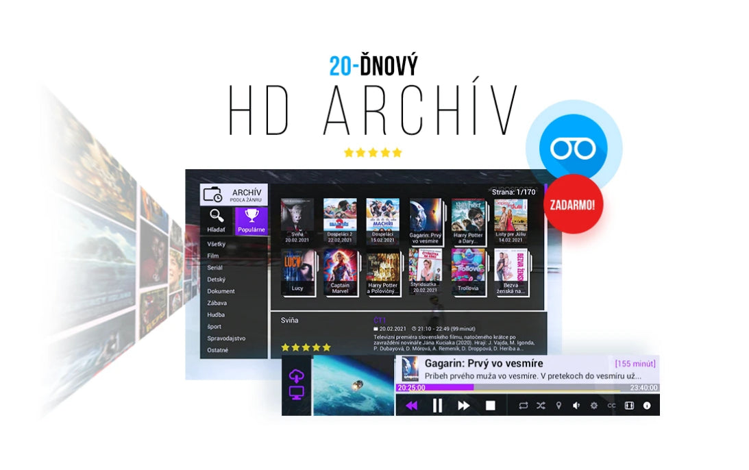 Just plug it in, connect to Wi-Fi and watch without restrictions. You will get access to dozens of Slovak and foreign TV channels, archives and streaming applications - all in one device.