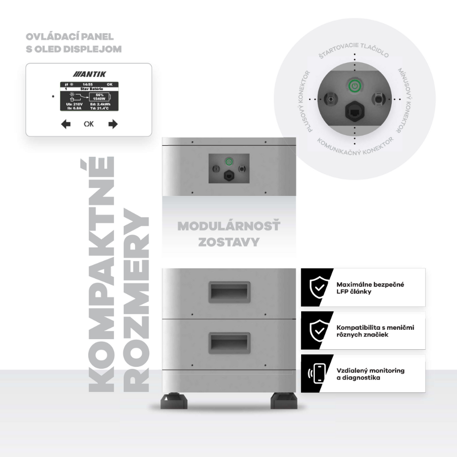 The front OLED panel with touch buttons and LED power indication provides an overview of the charge status, energy flows and instant power. The battery communicates via home Wi-Fi with the ANTIK Cloud , which allows remote monitoring and diagnostics down to the cell level . On the side panel there is an RJ45 communication port and a backlit start button .