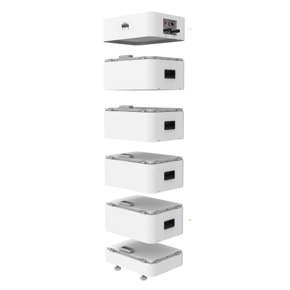 The storage system is designed as a modular, stackable assembly. Each device consists of a control and communication module , a set of battery modules , and a base . The individual modules are stacked “into stacks”, which simplifies capacity expansion and service. Modularity allows you to start with a smaller configuration and later expand it without interfering with the inverter or PV array.