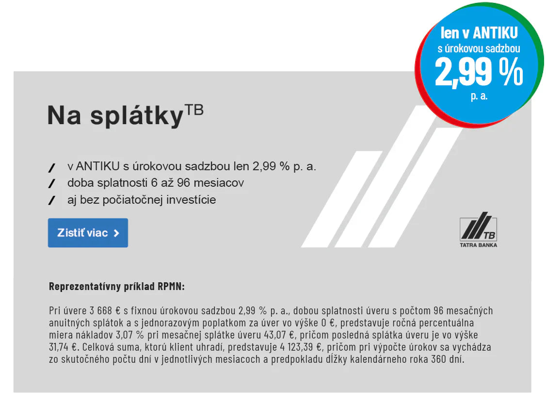 Switching to ecological heating no longer has to mean a large initial investment. With the Installment solution from Tatra banka, you can have an ANTIK 6 kW ECO heating system today and pay it off conveniently monthly - with an interest rate of only 2.99% pa.