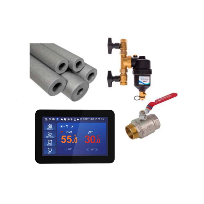 Complete set of accessories required for installation and start-up: plumbing material, magnetic filter, demineralization filter, valves, safety valves, automatic air vent valves, pipe insulation, electrical installation material