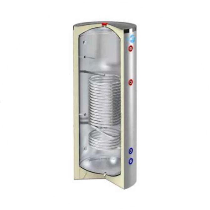 Freestanding storage tank for domestic hot water with a capacity of 200l. The tank contains an exchanger for heating with a heat pump and the possibility of installing an electric coil for reheating water from excess photovoltaics