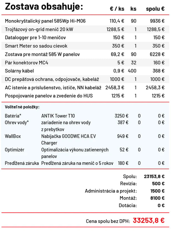 Photovoltaic system for companies with a 10-year warranty and a maximum output of 49.5 kW, consisting of a 50 kW 3-phase on-grid inverter, 90 pcs of monocrystalline silver panels with an output of 585 Wp, a roof structure according to the type of your roof and a complete electrical installation kit.