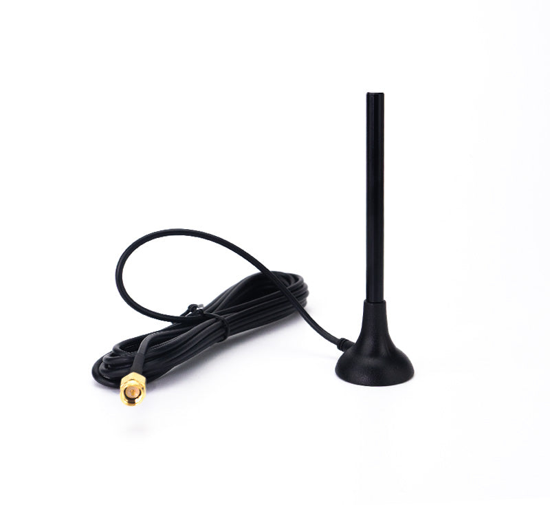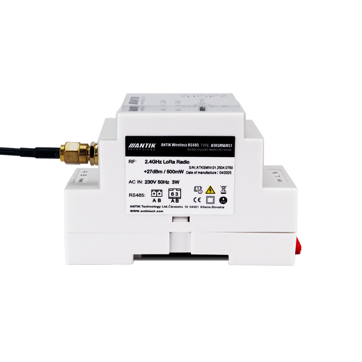 For more demanding installations, where the basic antenna cannot provide sufficient signal, it is possible to purchase an external antenna with higher gain and an extended connection cable for the ANTIK Wireless RS485 SMW RS1 module. The antenna is connected via an SMA connector and, thanks to the longer cable, it can be placed outside the distribution board, which allows you to optimize its position relative to the signal source.