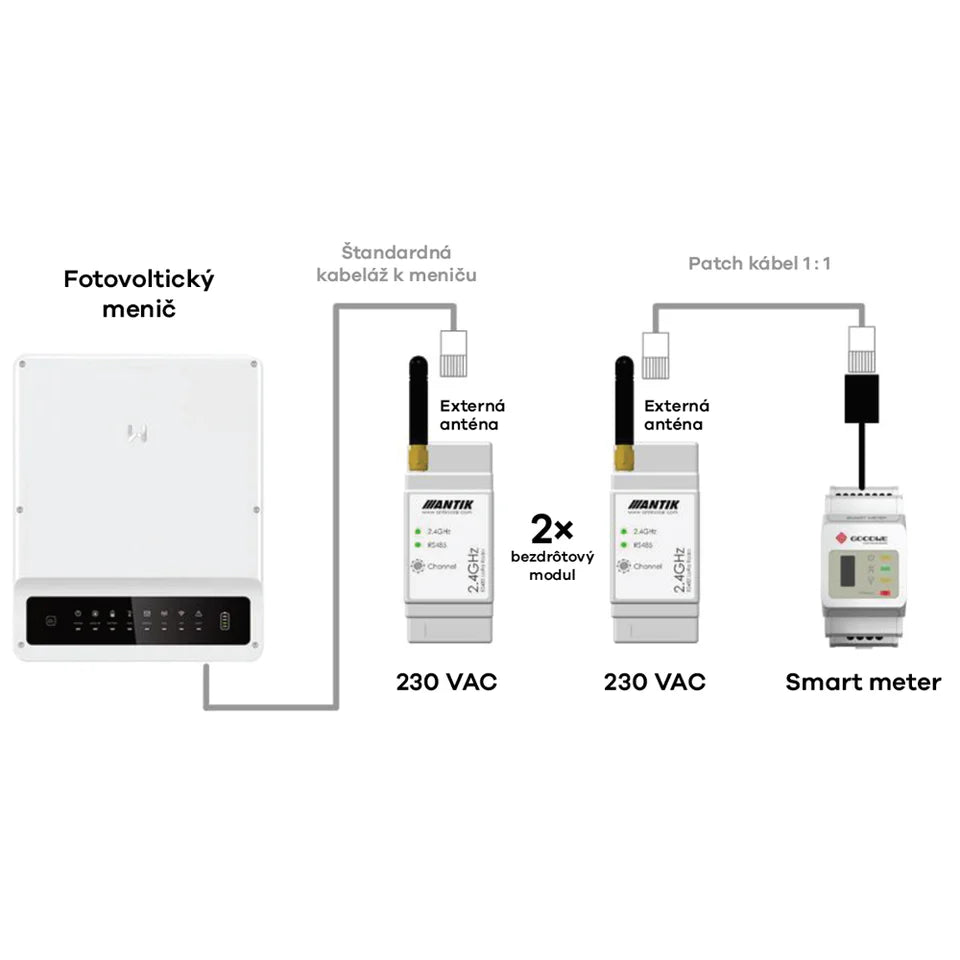 The system demonstrates wireless communication between a photovoltaic inverter and a smart meter using an RS485 bus. A standard cable carries the signal from the inverter to a wireless module that provides data transmission at a frequency of 2.4 GHz. The second module receives the signal and transmits it via a patch cable to the smart meter.