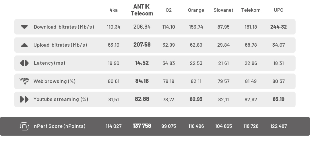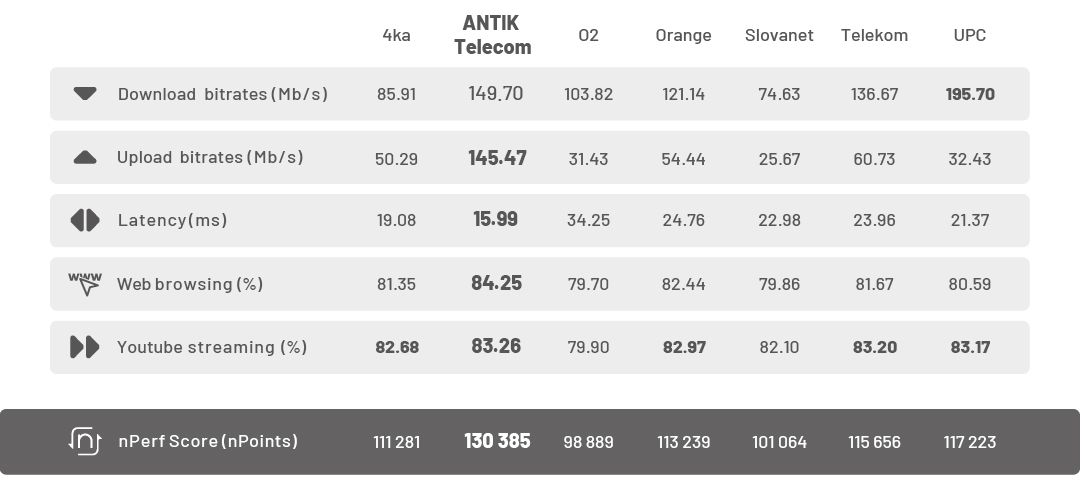Podľa najnovšieho veľkého porovnania platformy nPerf je ANTIK jednotkou medzi pevnými internetovými pripojeniami na Slovensku. Aj v roku 2025 sme si obhájili prvenstvo a potvrdili našu pozíciu lídra v kvalite, rýchlosti a spoľahlivosti internetu.